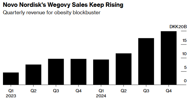 诺和诺德公布第四季度销售额为857亿克朗(合119亿美元),超过分析师预期。Wegovy和Ozempic的销售都达到了预期。该公司对今年营业利润的预测高于销售额,按固定汇率计算,预计营业利润将增长19%至27%。