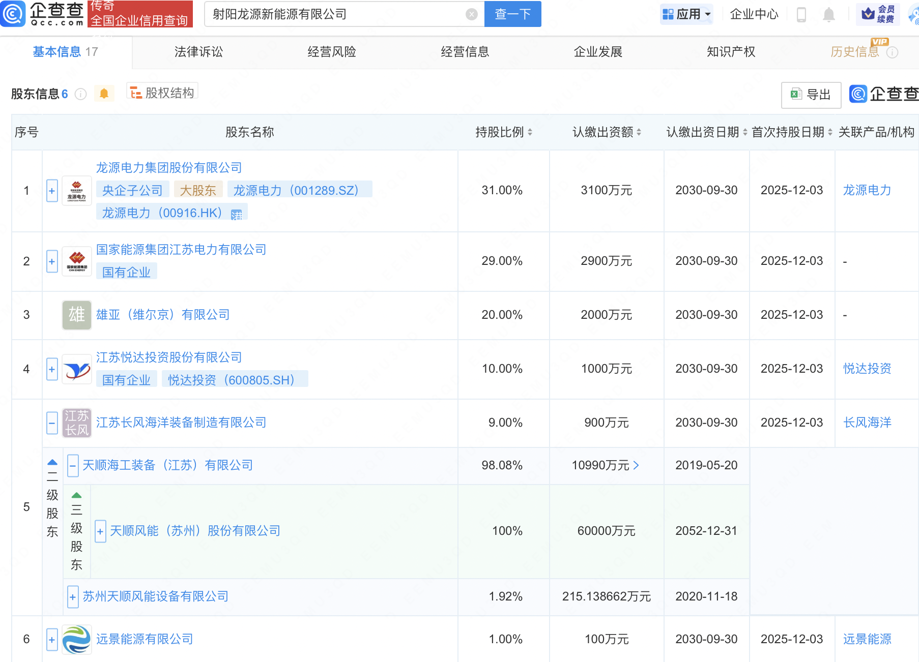 近日股票杠杆什么,射阳龙源新能源有限公司成立,注册资本1亿元,经营范围包含:风力发电技术服务;太阳能发电技术服务;电气设备修理;海上风电相关系统研发等。企查查股权穿透显示,该公司由龙源电力(001289)、国家能源集团江苏电力有限公司、悦达投资(600805)、天顺风能(002531)旗下江苏长风海洋装备制造有限公司、远景能源有限公司等共同持股。
